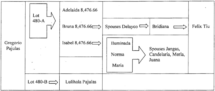 c) In 1962, the Pajulas sisters agreed to divide Lot No. 480-A equally among themselves;9 d) Upon the death of Isabel, her share was inherited by her heirs, namely: her husband and children Iluminada Gadiane (Iluminada), Norma Gadiane (Norma) and Maria Gadiane-Ortiza (Maria) (Gadiane sisters);10 e) On August 5, 1974, Norma sold to Spouses Jangas a portion of her share with an area of 1,462 sq m, which the latter declared in the name of Petronila under TD No. 21-827;11