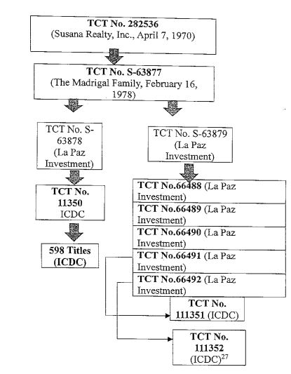 ICDC is the registered owner and developer of Susana Heights Subdivision in Muntinlupa City, including the three parcels of land which comprise its Villages 2, 3, 4 and 5 (subject property). These properties were previously covered by Transfer Certificate of Title (TCT) Nos. 111350, 111351, and 111352 of the Register of Deeds of Makati City.5 TCT No. 111350 was later subdivided into 598 smaller lots, for sale to potential buyers. TCT No. 111350 was cancelled and 598 TCTs were issued in the name of ICDC.6 These titles cover about 6,143,000,000 square meters.