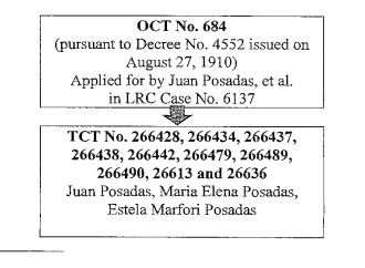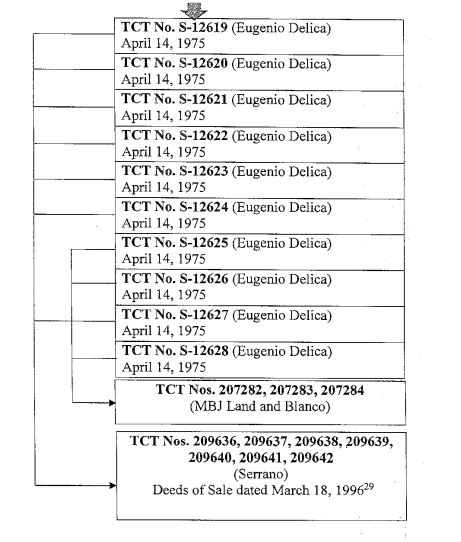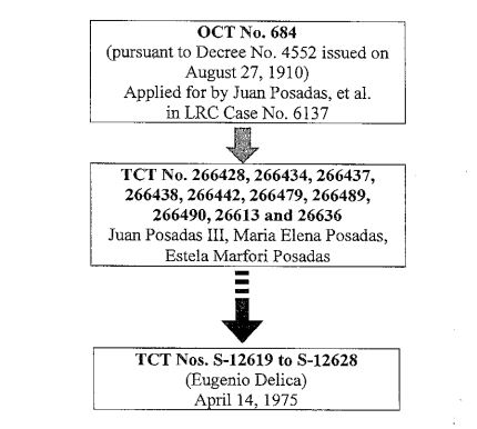 In their Answers, Delica, Ilagan, and J&M Properties averred that Delica was the original owner of 10 parcels of land located in Bagbagan, Tunasan, Muntinlupa with a total area of 206 hectares and covered by TCT Nos. S-12619, S-12620, S-12621, S-12622, S-12623, S-12624, S-12625, S-12626, S-12627, and S-12628 (Delica titles) issued on April 14, 1975. They alleged that the parcels of land were acquired in good faith by Delica from Juan Ma. Posadas, et al. (Posadas titles). The Posadas titles were derived from OCT No. 684, the mother title of the Delica titles.14
