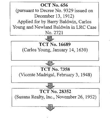 TCT Nos. 111350, 111351, and 111352 covering the subject property could be traced directly to and are derived from Original Certificate of Title (OCT) No. 656 issued by the Register of Deeds of Rizal.7 OCT No. 656 was issued pursuant Decree No. 9329 dated December 13, 1912 in Land Registration Case (LRC) No. 2721, which was applied for by Barry Baldwin, et al. (Baldwin Application).8